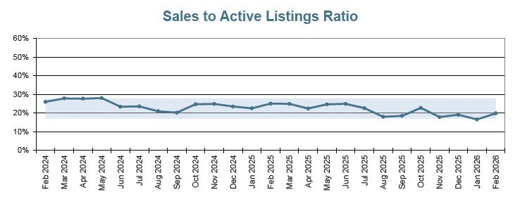 There were 2,903 active listings for sale on the Victoria Real Estate Board Multiple Listing Service® at the end of February 2026, an increase of 10.6 per cent compared to the previous month of January and a 10.4 per cent increase from the 2,630 active listings for sale at the end of February 2025.