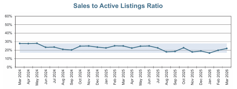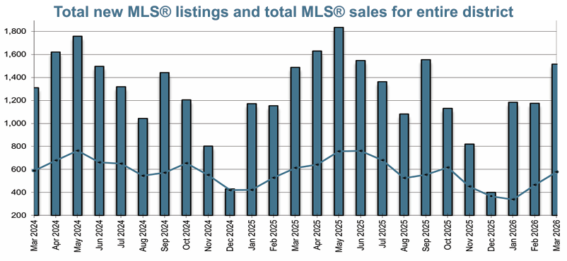 A total of 579 properties sold in the Victoria Real Estate Board region this March, 5.5 per cent fewer than the 613 properties sold in March 2025 and 24.5 per cent more than in February 2026. Sales of condominiums decreased by 18.8 per cent from March 2025 with 164 units sold. Sales of single family homes decreased by 2.4 per cent from March 2025 with 285 sold.
